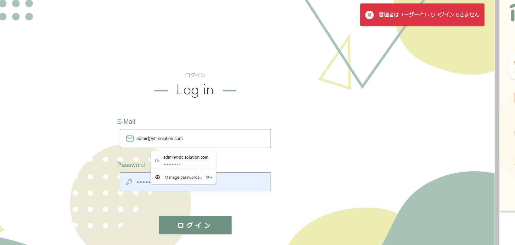 Message chưa phù hợp 管理者はユーザーとしてログインできません