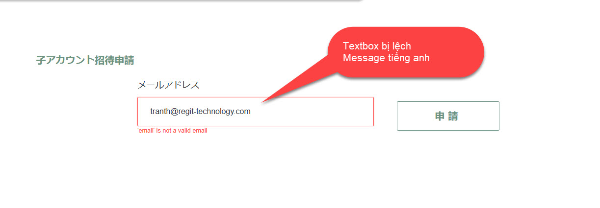 2. Nhập mail sai định dạng, required hiển thị message tiếng nhật