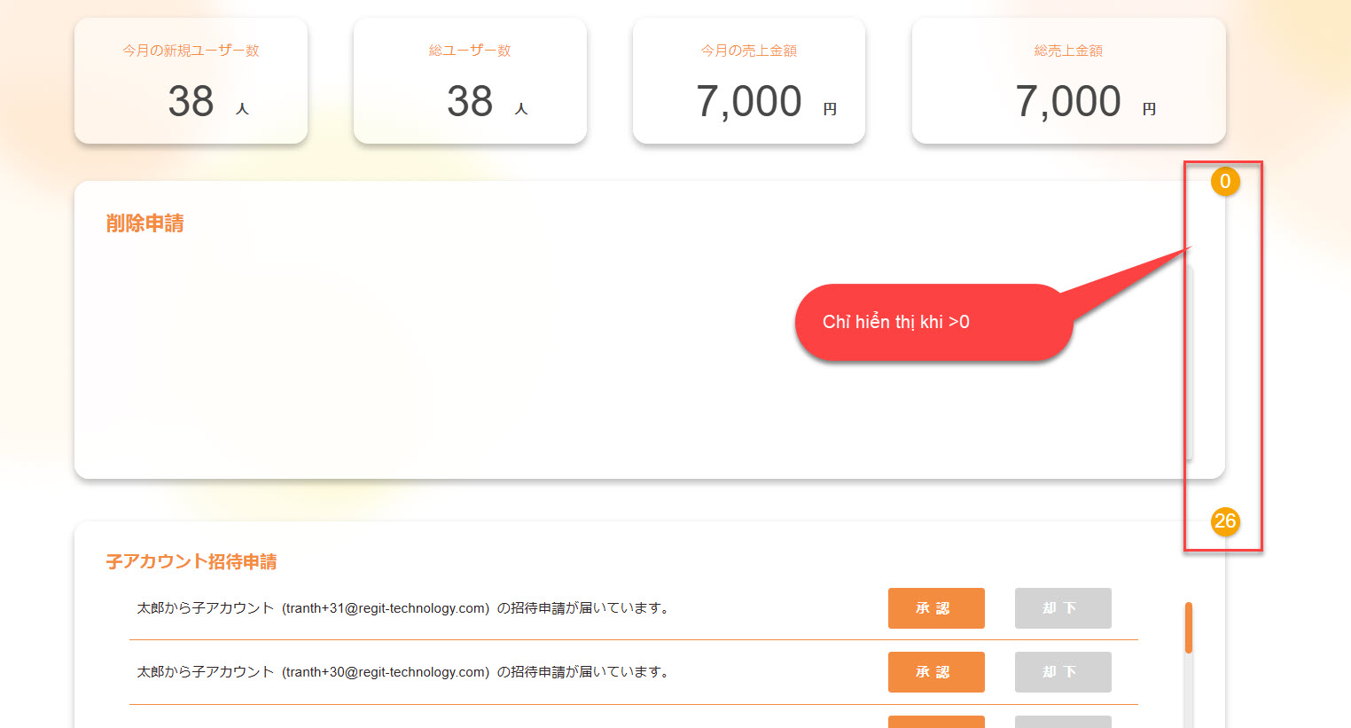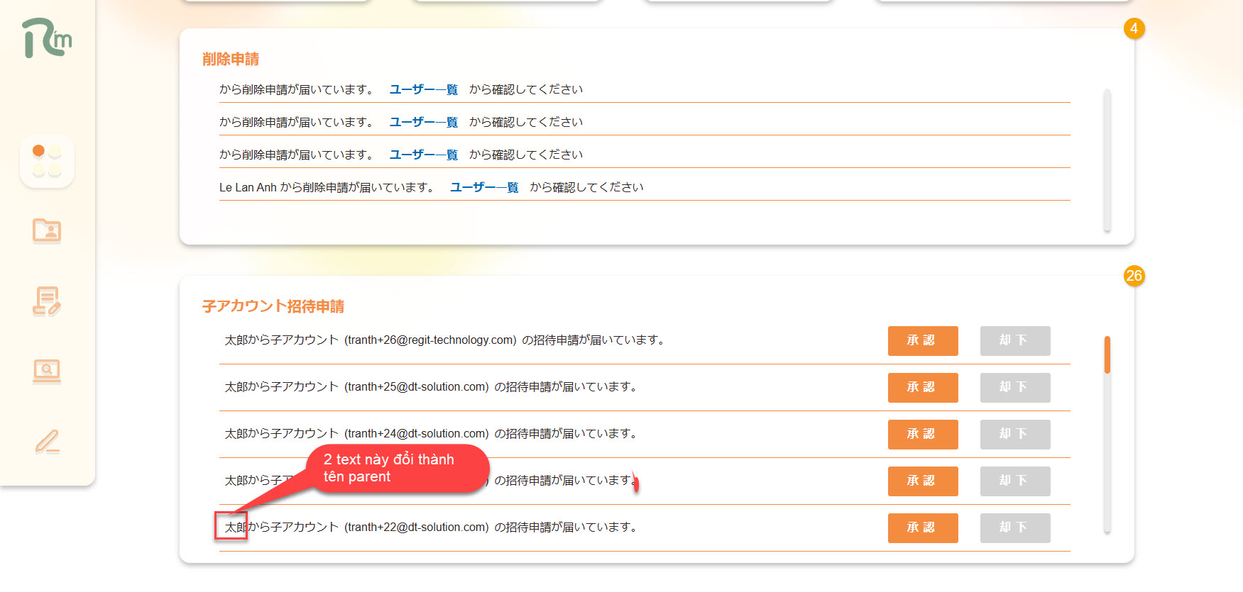 2. Mục danh sách child account chờ duyệt đổi text 太郎 thành hiển thị tên parent