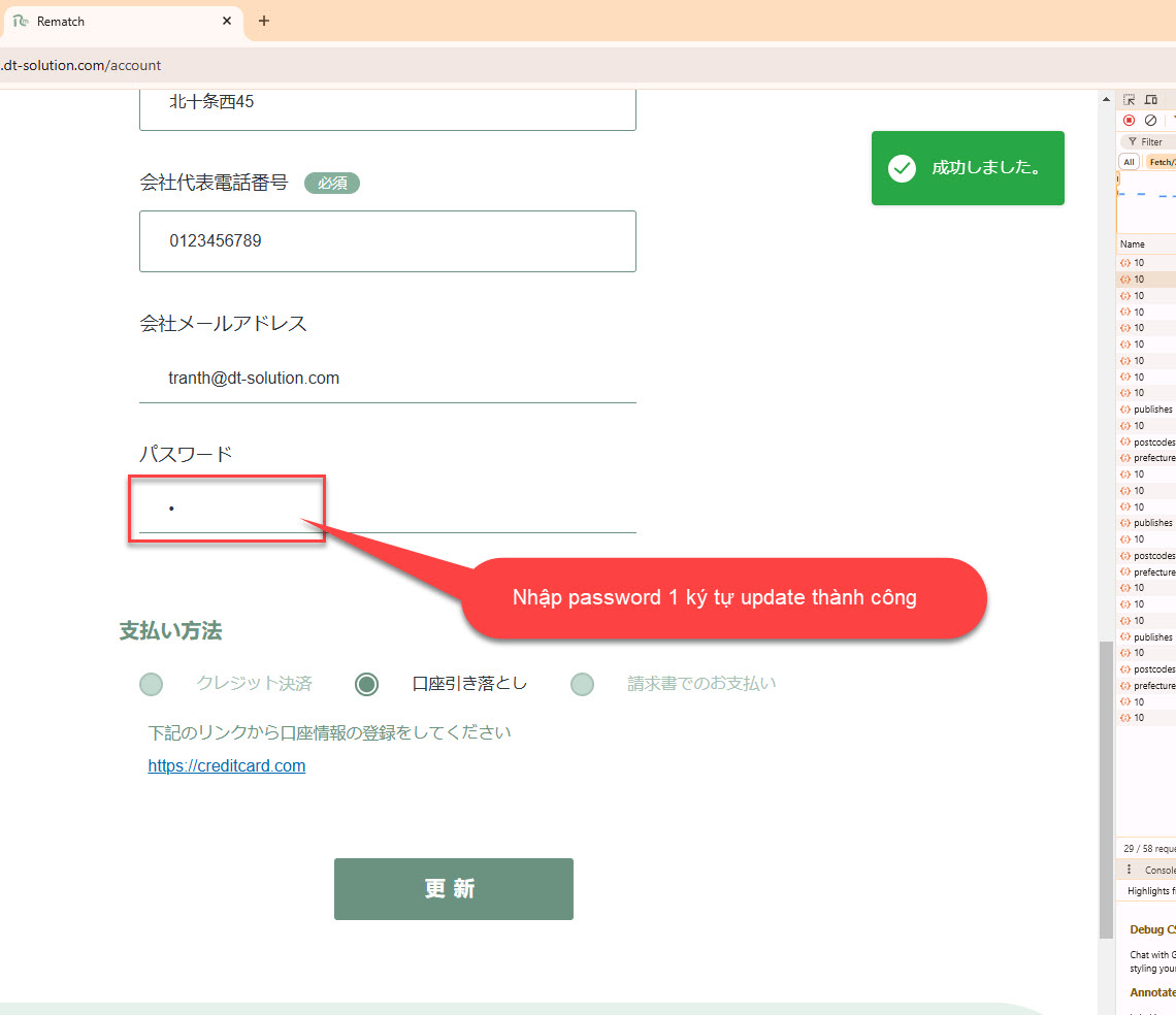 Update password = 1 ký tự thành công