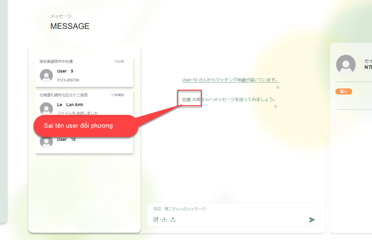 2. Sau khi matching message tự động さんへメッセージを送ってみましょう。 hiển thị sai tên user đối phương