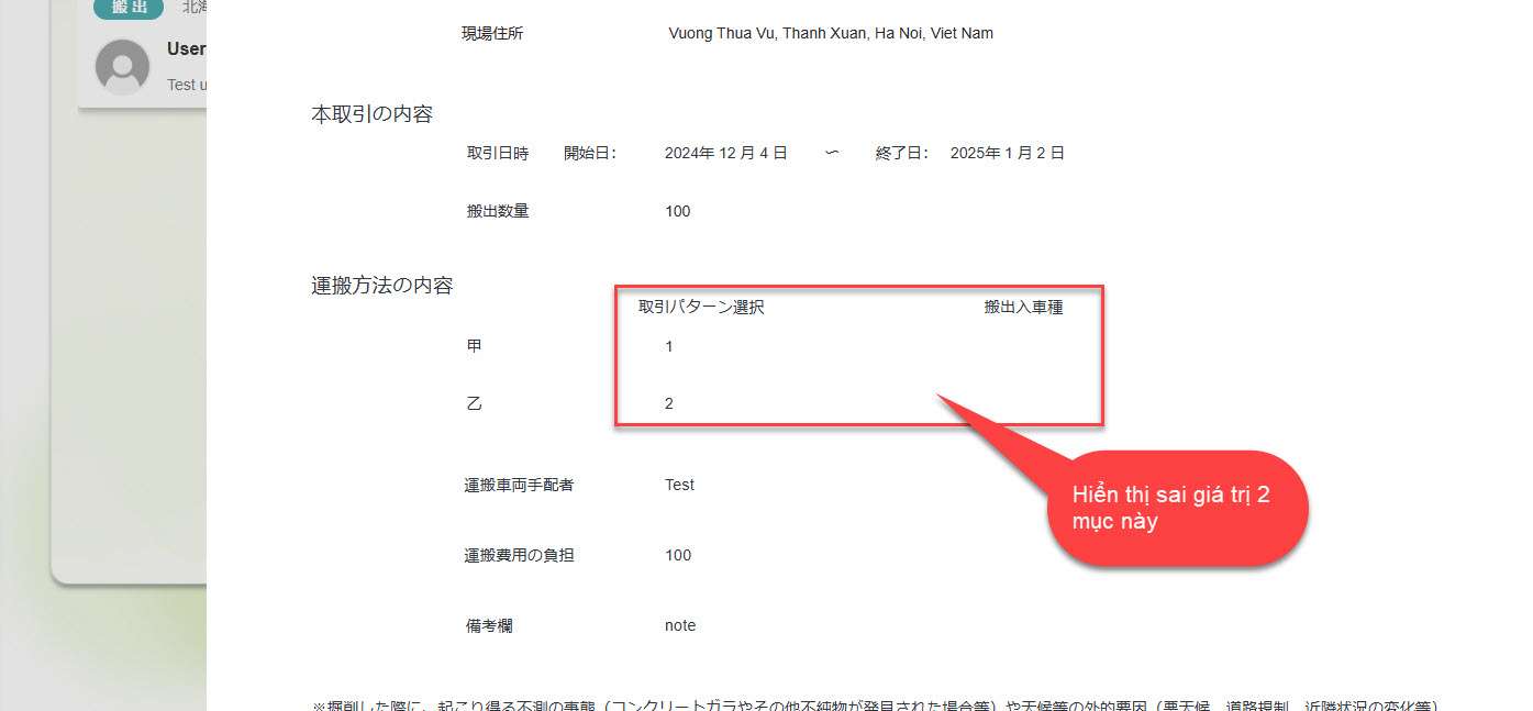 2.Detail consent hiển thị sai thông tin mục 運搬方法の内容