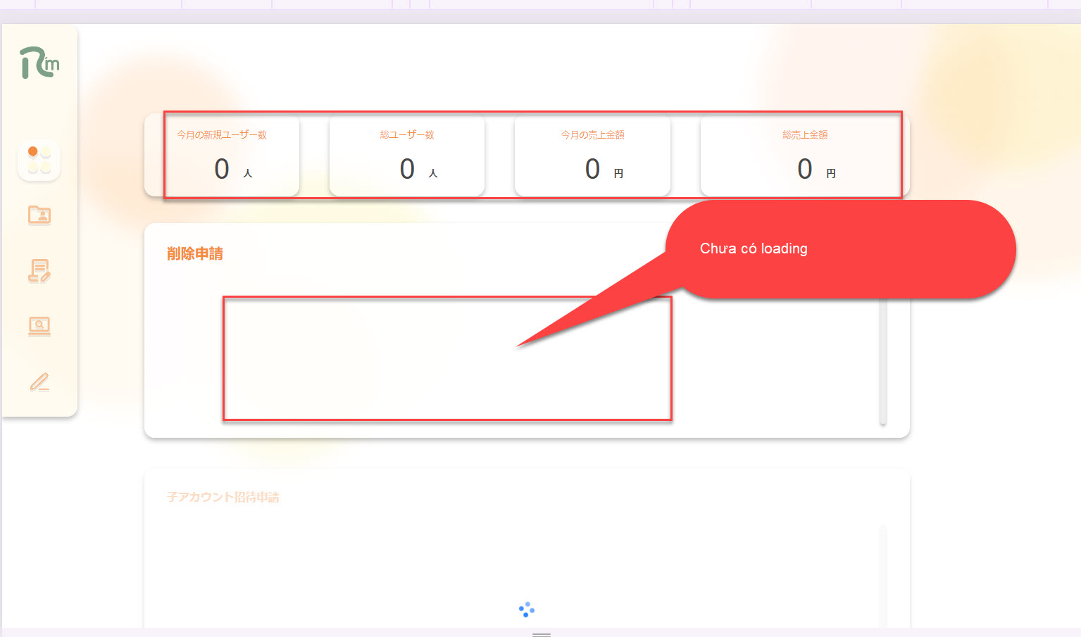 [Admin] [Home] Mục list user yêu cầu xóa, hàng thống kê số user chưa có loading