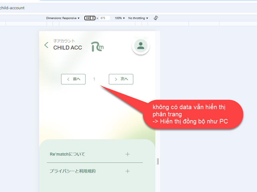 2. Trên SP màn list child account không có data cũng hiển thị phân trang