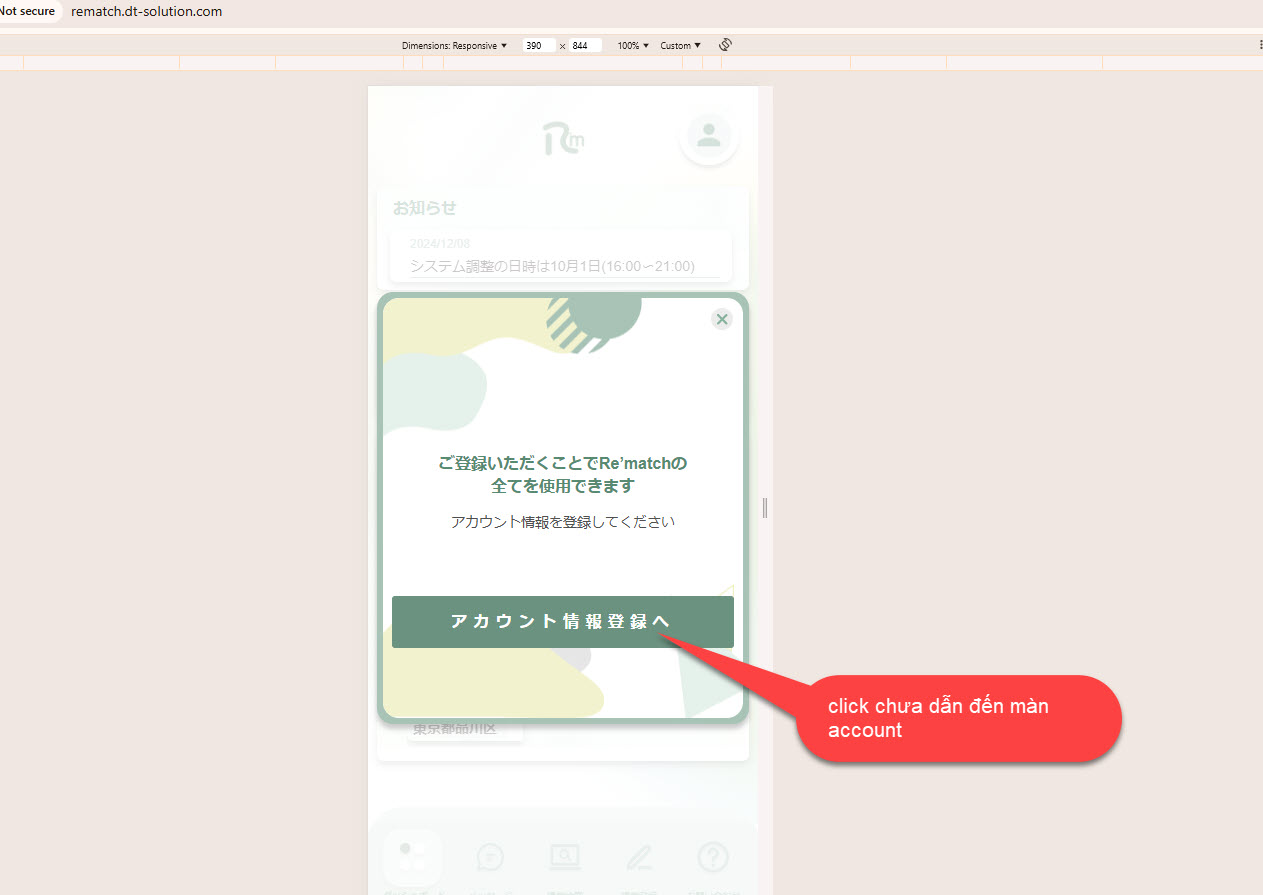 [User] [Home] Tại popup thông báo đăng ký tài khoản, click button chưa dẫn đến màn account