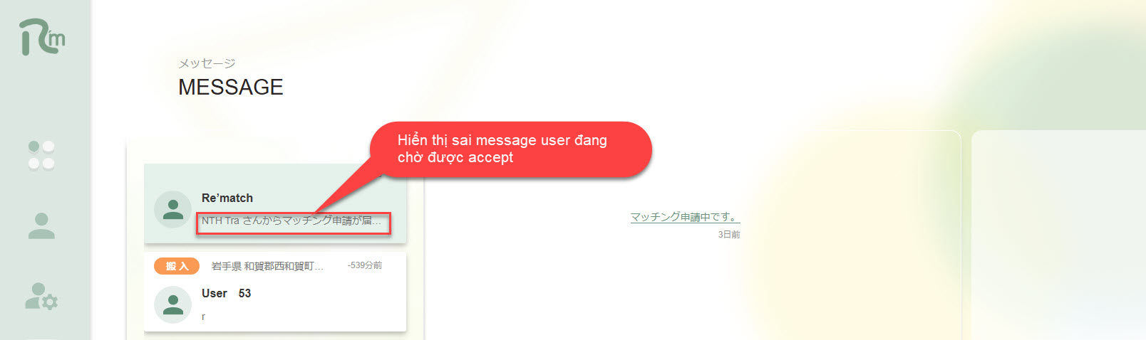 2. User đang chờ được accept hiển thị message マッチング申請中です。